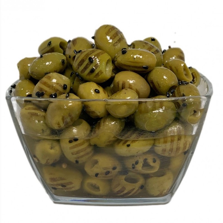 زیتون کبابی مزه دار شده همراه با سیر ، فلفل، لیمو همراه با روغن زیتون