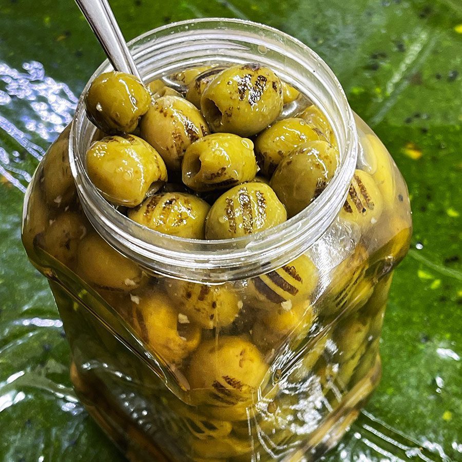 زیتون کبابی مزه دار شده همراه با سیر ، فلفل، لیمو همراه با روغن زیتون
